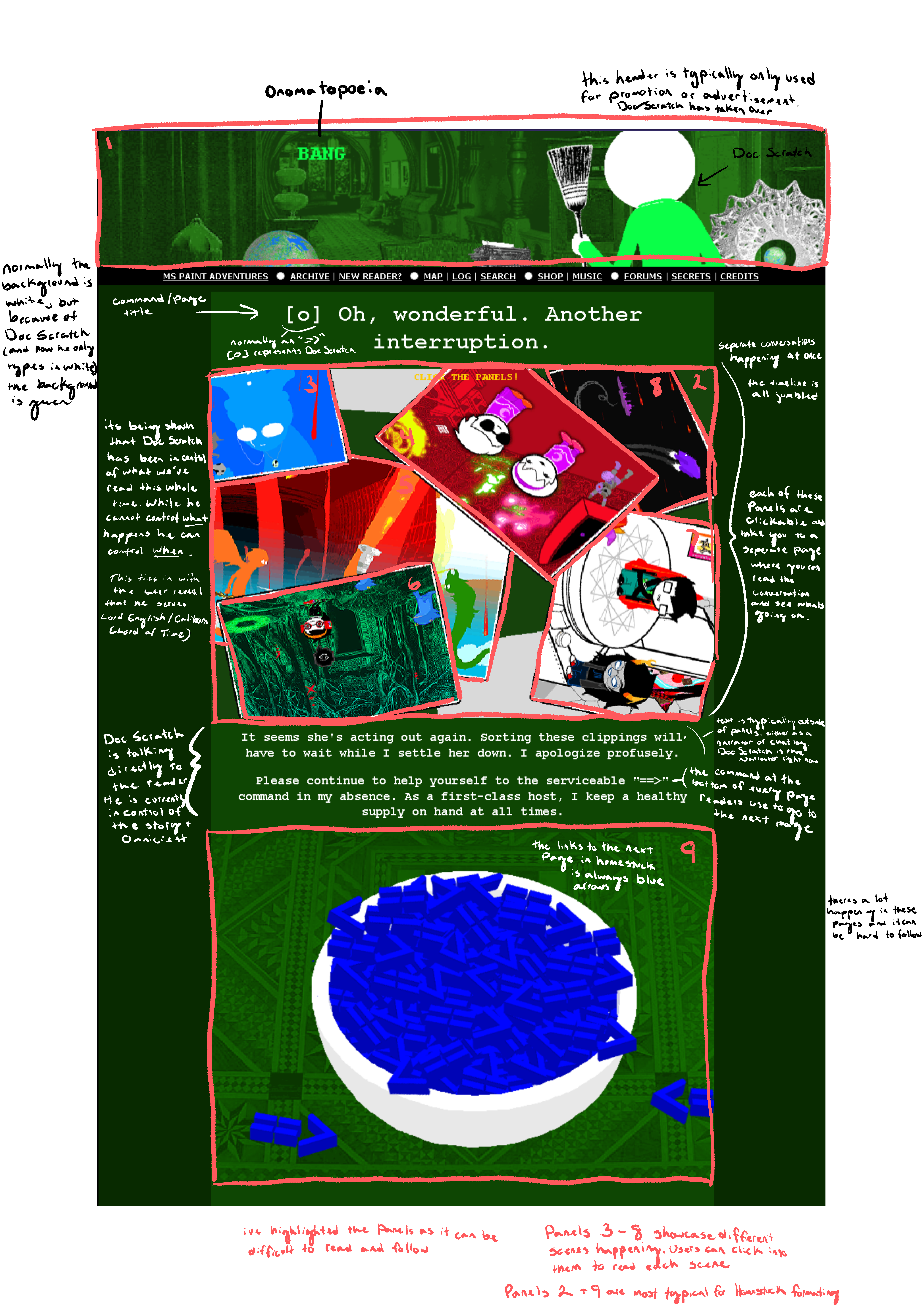 Context: Slightly different format from most comics. Homestuck is a multimedia webcomic hosted currently at homestuck.com. This annotation is a screenshot from the webpage. This page features a bunch of jumbled together panels due to a scrapbook falling and a bunch of the photos falling out. The reader is currently in Doc Scratch's domain and is at his whim during this segment. The reader is able to click on each of the pictures in panel 2 in order to see what is happening in that frame. This segment of the comic also messes with the established form (using the header as a panel). It really showcases how little control the reader has and how much is dictated by Doc Scratch (an all knowing time demon)