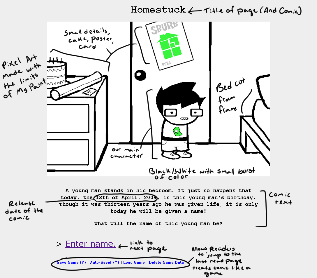 Context: The first page and the first flash game of Homestuck. Simple in style and heavy on the text, we are introduced to our protagonist John Egbert. The comic itself is styled after choose your own adventure games with the links going to the following pages being titled like commands