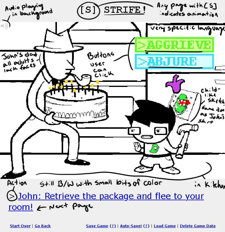 The comic was known for being highly interactive outside of that. Mini-games existed within the comic that allowed the reader to take control of a character and interact with the world in order to keep reading. Because the comic was hosted on a webpage, Andrew Hussie was also able to have a single page branch off into different sections at once with it all looping back to the starting point. In this page of the comic, readers are able to click on the different panels that then take you to different parts of the story all happening at the same time.