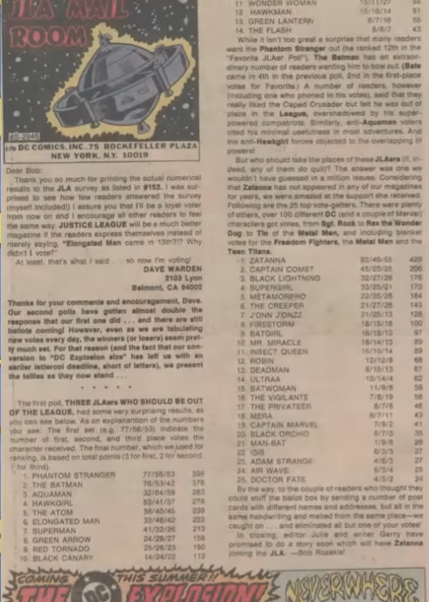 DC Comics is well known for is large number of superheroes. Among them is Zatanna Zatara, a magician super-heroine first introduced in HAWKMAN #4 (1964). Today in the modern era, she’s a well known and respected member of the Justice League, but that wasn’t always the case. In issue #51 of Justice League of America, she was voted in unanimously by the Justice League. In reality, she was voted in by the audience!