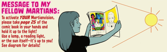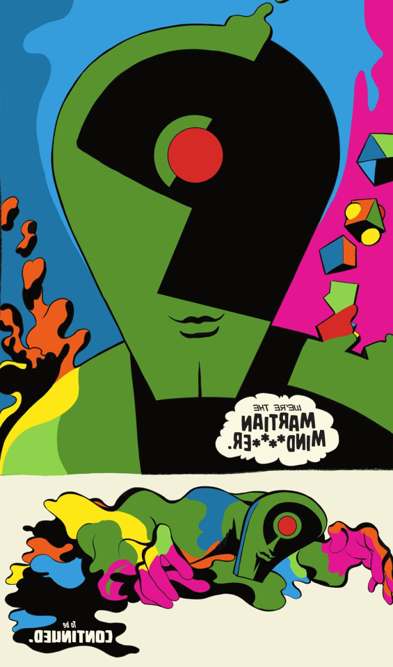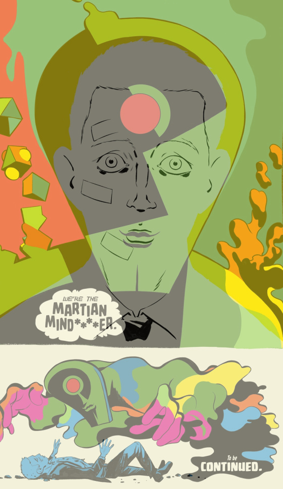 Notably, in the last page of the first and sixth issue the reader is instructed to hold the page up to the light in order to see the full picture. In the first issue, what is at first just a head-shot of John Jones on a yellow background, becomes a vibrant colorful overlay of John Jones and the Martian. As the martian says to John: “We are the Martian Mind****er”