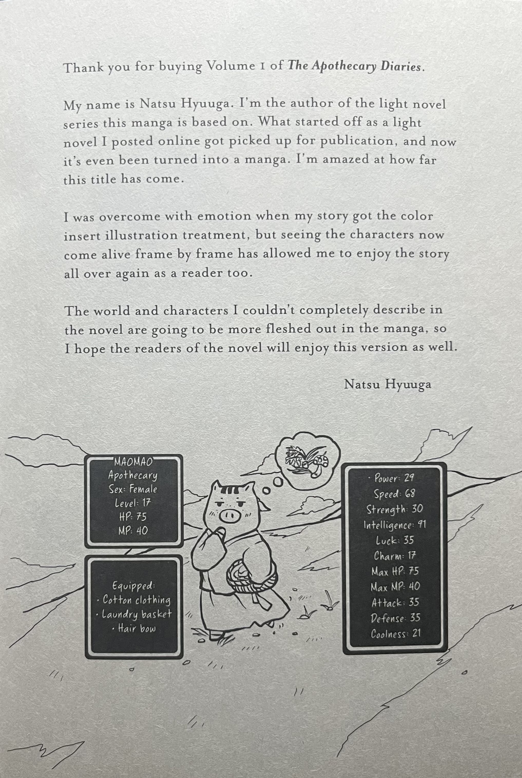 This page here is a small authors note by the light novel author Natsu Hyuuga. It also features a drawing of the character Maomao as a pig with game like stats displayed on the side. These small details give us insight into Maomao’s character while also getting to hear directly from the author.