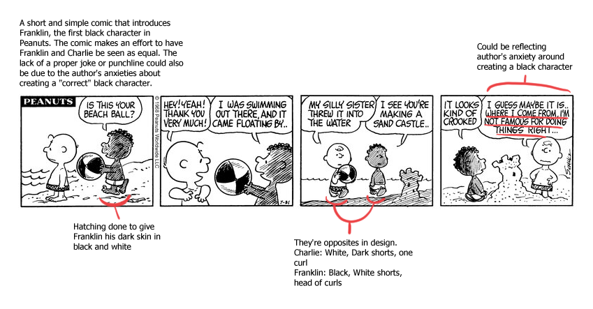 It’s important to note that Charles Schulz was incredibly hesitant at the time to introduce a black character, large in part due to fear of misrepresentation and backlash. After plenty of deliberation, and a lot of back and forth between Harriet and Charles, Franklin debuted in Peanuts. The comic was made up of four panels and depicted Franklin returning a lost beach-ball to Charlie.